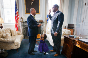 Thursday, November 14, 2013 – Governor Patrick administers the official oath of office to Serge Georges, Jr. as an Associate Justice of the Boston Municipal Court, Roxbury Division in the Governor’s Office.